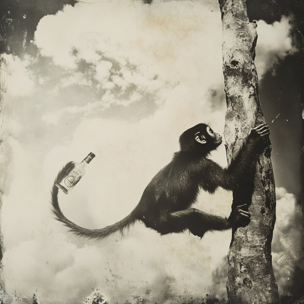 Создано на основе запроса: old photograph of a spider monkey drinking from a Mezcal bottle hold by her tail, the spider monkey is holding