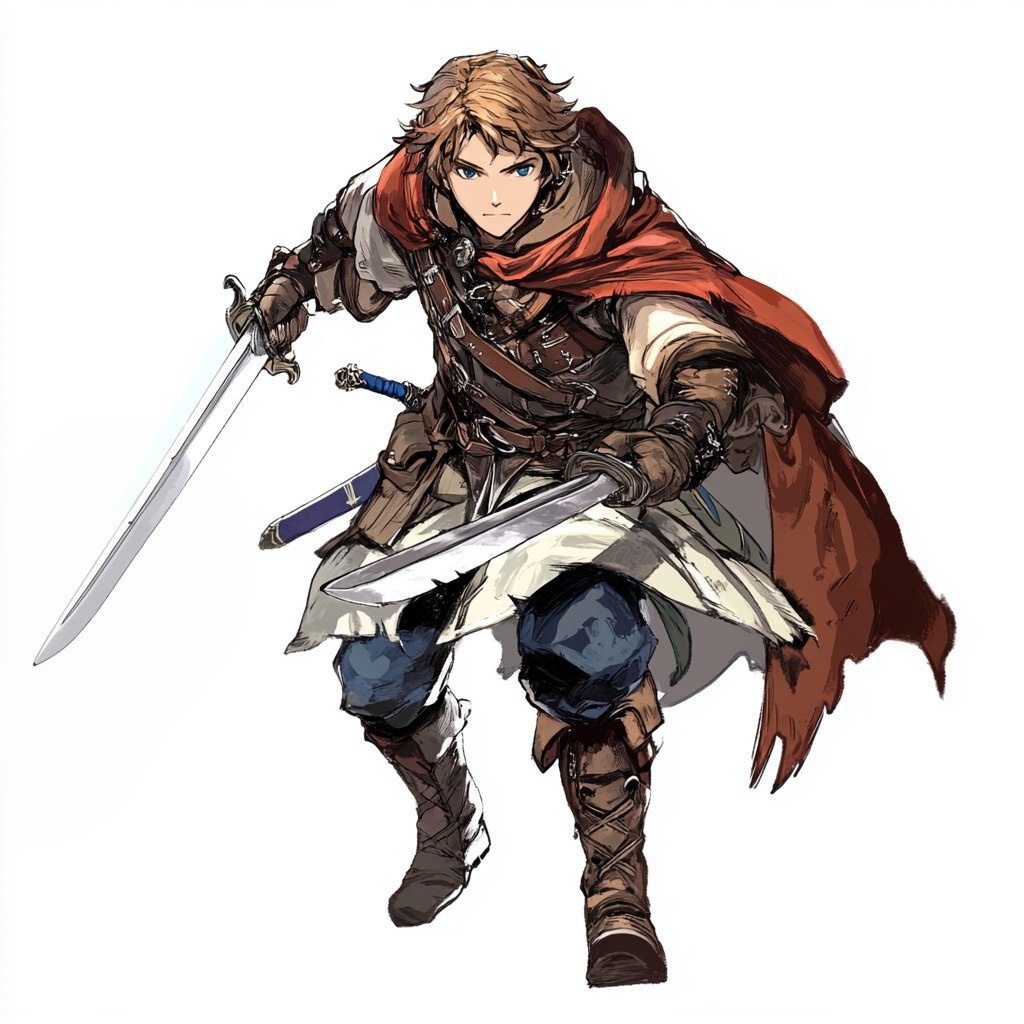 Создано на основе запроса: Fantasy concept illustration, Male, Human, Short golden brown hair, Blue eyes, Thief-Warrior, Captivating, Heavy leather armour, Rapier with guard in the right hand, Parrying dagger with guard in left hand, Hooded, No cloak, German Renaissance style, Exaggerated fantasy details, Linen clothes with strong colors, High boots, White background, High quality, Exaggerated fighting pose --- Автоперевод: Фэнтезийная концепция иллюстрация, мужчина, человеческие, короткие золотые коричневые волосы, голубые глаза, вор-вор, очаровательная, тяжелая кожаная броня, рапира с охраной в правой руке, парирование кинжала с охранником в левой руке, капюшона, без подсветки, немецкий стиль ренессанса, преувеличенные фантастические детали, льня Как тебе такое изображение? 🤔 https://dzen.ru/id/65c0c65c86e4f837c27b24d7 #ИИ #AI #нейросеть #midjourney #art