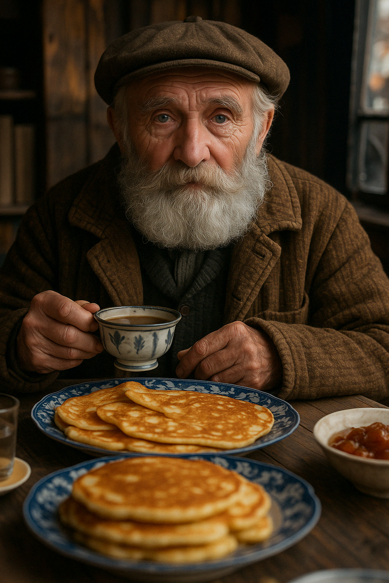 Мать положила деду в тарелку горку блинов, пододвинула плошку с его любимым сгущеным молоком и налила в большой бокал душистого чёрного свежезаваренного чая. Старик, свернув блин треугольничком, зачерпнул им сгущенку и запихал его в рот.