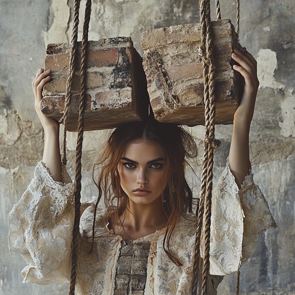 Создано на основе запроса: fashion editorial concept with ysl model, half body, natural skin. They hold onto large, raw, textured bricks suspended by thick ropes, creating a striking contrast between the delicate fabric and rugged materials. enhancing the refined yet artistic ambiance. elements of high fashion. --- Автоперевод: Редакция моды с моделью YSL, половина тела, натуральная кожа. Как тебе такая картинка? 🤔 https://dzen.ru/id/65c0c65c86e4f837c27b24d7 #ИИ #AI #нейросеть #midjourney #art