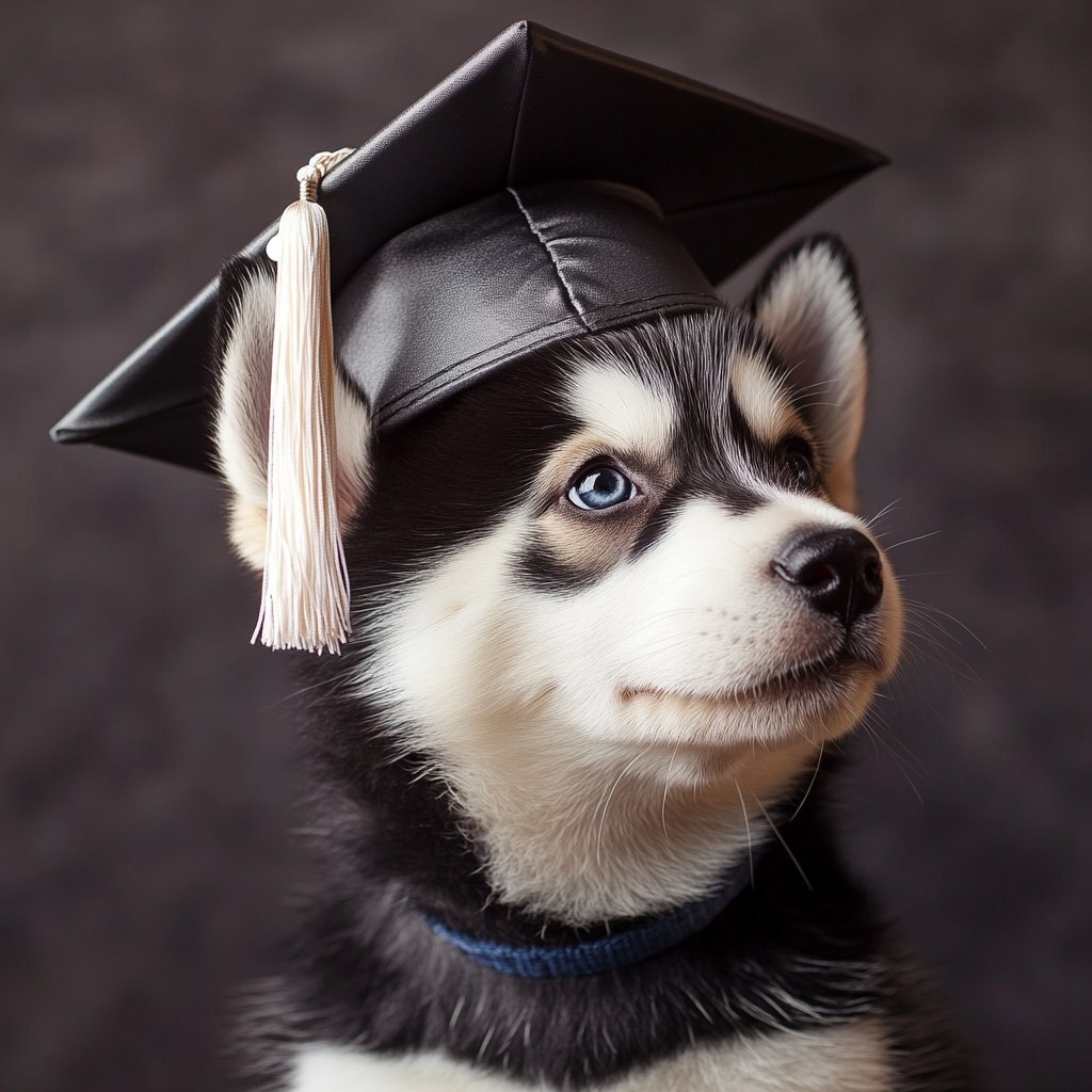 Создано на основе запроса: a cute realistic photo of a husky dog puppy in a graduation cap