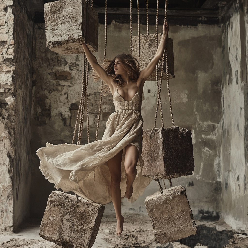 Создано на основе запроса: fashion editorial concept with ysl model, dancing pose, natural skin. They hold onto large, raw, textured bricks suspended by thick ropes, creating a striking contrast between the delicate fabric and rugged materials. enhancing the refined yet artistic ambiance. elements of high fashion. --- Автоперевод: Модная редакционная концепция с моделью YSL, танцующая поза, натуральная кожа. Как тебе эта иллюстрация? 🤔 https://dzen.ru/id/65c0c65c86e4f837c27b24d7 #ИИ #AI #нейросеть #midjourney #art