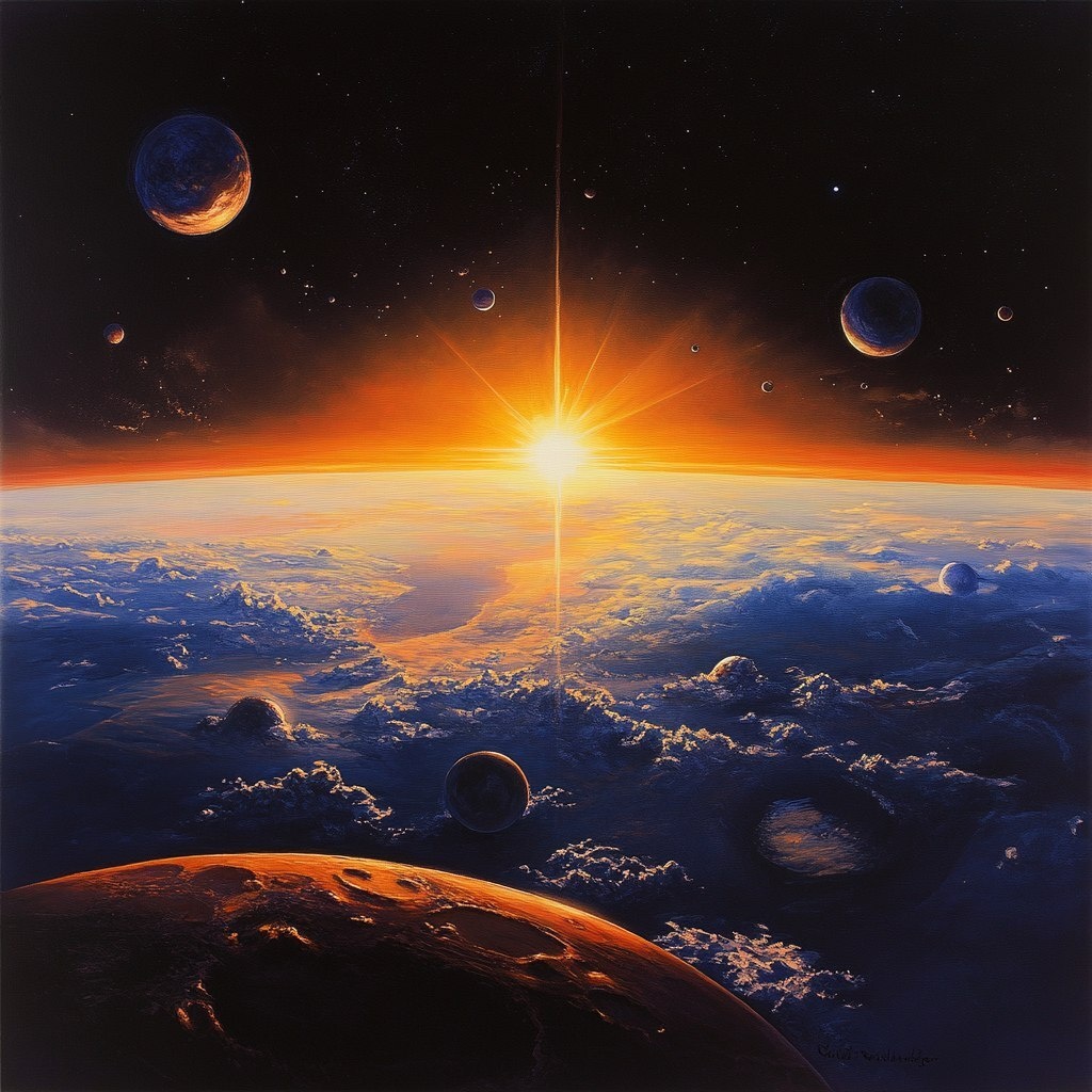 Создано на основе запроса: sci view of earth, sunrising over planet and alien planets --- Автоперевод: SCI вид на Землю, солнечный заход над планетой и инопланетными планетами Классно вышло? 🤔 https://dzen.ru/id/65c0c65c86e4f837c27b24d7 #ИИ #AI #нейросеть #midjourney #art