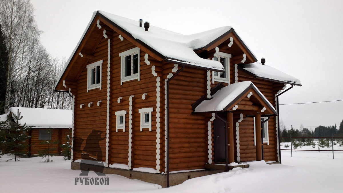 Снаружи дом покрыт защитным составом приятного цвета с акцентами белым на окна, наличники и торцы брёвен выступающих наружу (зауголки). Цвет подшивов карнизных и фронтонных свесов крыши подобран в тон стенам. Если вы обратили внимание - подшивы открытого типа с видовыми стропилами, такая конструкция называется «кобылки».