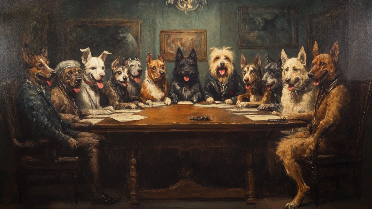 Создано на основе запроса: high quality oil painting of DoD DMAG meeting but it's dogs, Rembrandt style