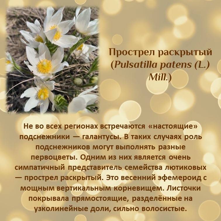 Кое-где уже наступило настоящее лето, но во многих других регионах еще ранняя весна и самое время цветения растений-первоцветов. А мы продолжаем рубрику растения в карточках. Сегодня знакомимся с прострелом раскрытым (Pulsatilla patens (L.) Mill.) Народное название этого растения — «сон-трава».