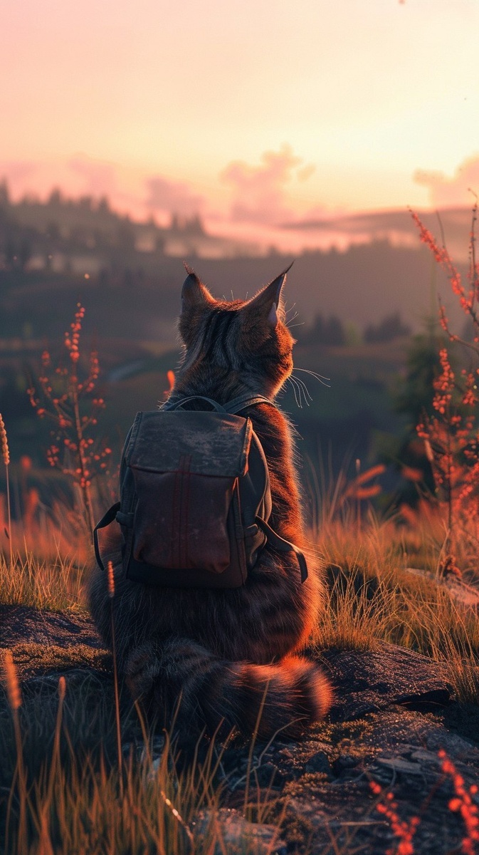Создано на основе запроса: a realistic bipedal cat with a small backpack, standing on a hill at sunrise, looking at a vast dreamy landscape, warm cinematic lighting