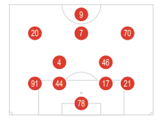 Минусы - требуется высокая организованность команды. Потеря позиций грозит разрывами между линиями. Особенно это актуально для центральных полузащитников. Они должны действовать максимально надежно. В противном случае, при провале одного из опорных хавбеков, перед соперником появляется огромное пустое пространство. Также многое зависит от состояния игрока на позиции десятки. В нашем случае это Артём Симонян. На схеме он под седьмым номером. Его первоочередная задача - креатив и управление игрой команды в атаке, но и оборонительные задачи с него никто не снимал.