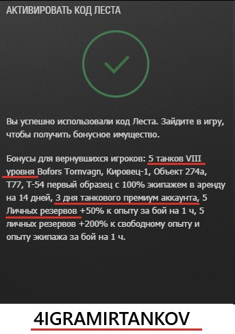 4IGRAMIRTANKOV Дает прем танки в аренду и личные резервы. Полный список получаемого внутриигрового имущества написан на скриншоте выше. Данный бонус код пригодится тем, кто более 30 дней "отдыхал" от танков - потому он и возвратный. Как ни странно - у меня он сработал. Однако нового имущества, в ангаре, я не нашёл. Проверяйте у себя сами.