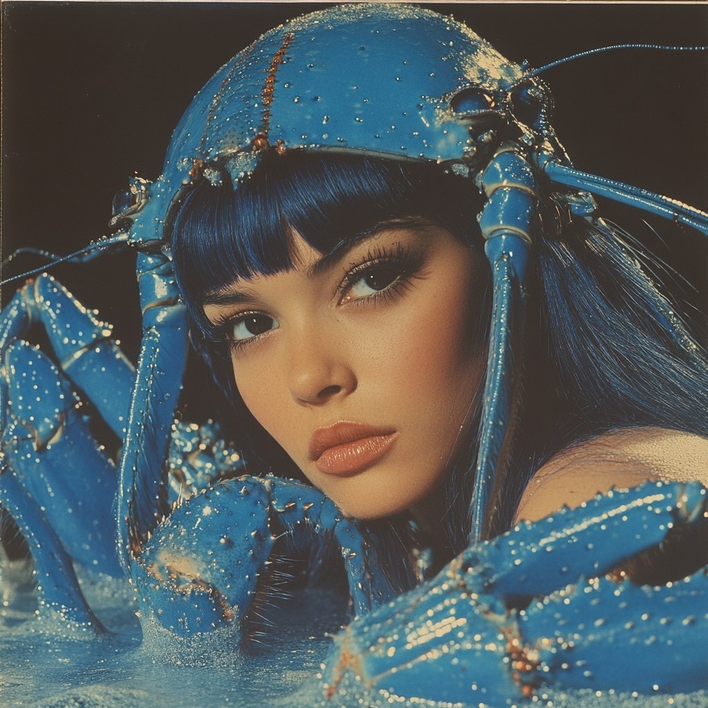 Создано на основе запроса: crustacean blue screen, astrological maiden of floating liquid sand by Pierre Cardin and Herb Lubalin