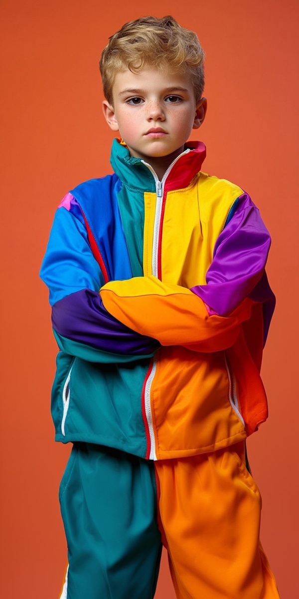 Создано на основе запроса: A kid in a colourful 80s tracksuit. Sullen look of a model. Photo studio lighting. --- Автоперевод: Ребенок в красочном спортивном костюме 80 -х. Какое твое мнение? 🤔 https://dzen.ru/id/65c0c65c86e4f837c27b24d7 #ИИ #AI #нейросеть #midjourney #art