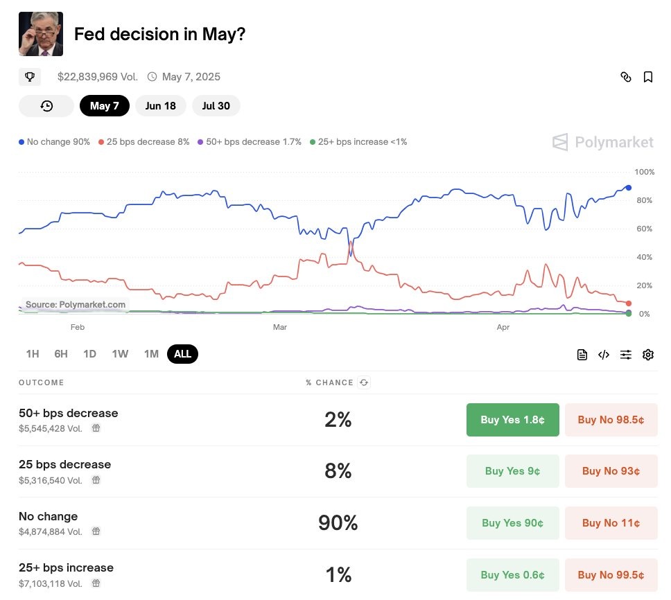🔸По данным Polymarket, вероятность того, что 7 мая Федеральная резервная система США оставит ставки без изменений, достигла 90%.