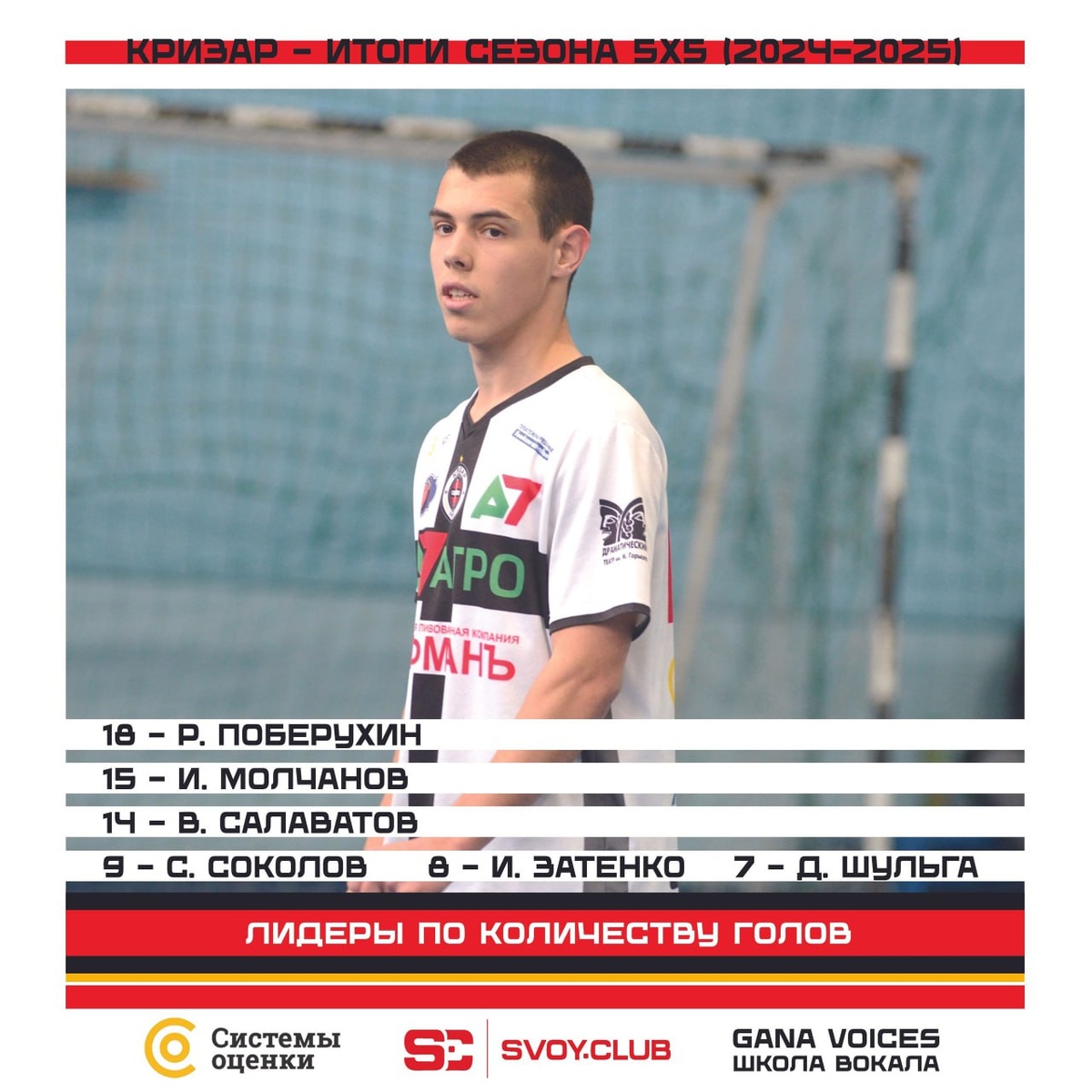 ❤️🖤 ИТОГИ СЕЗОНА 2024-2025 В ФОРМАТЕ 5Х5. ЛИДЕРЫ КРИЗАРА ПО КОЛИЧЕСТВУ ЗАБИТЫХ МЯЧЕЙ. Всего Кризар в сезоне наколотил 88 голов. Главным бомбардиром Команды стал Рома Поберухин с 18 голами. На три мяча меньше забил Ваня Молчанов. Вадим Салаватов с 14 голами стал третьим в списке клубных бомбардиров сезона. Далее по списку идут Серега Соколов с 9 голами, Илья Затенко с 8 голами и Данила Шульга с 7 голами. Шесть выше перечисленных игроков в сумме забили 71 гол, что в процентном соотношении равно 80,5 % голов. На оставшихся 10 полевых игроков пришлось чуть менее 20 % забитых мячей. Очень сказалась на нашей результативности травма кэпа Шульги, выбывшего на целых 6 ! матчей. Уверены, что сыграй Даня больше матчей - забил бы больше. Не можем не отметить и нашего шестнадцатилетнего Ярослава Волкова, который в шести дебютных играх дважды огорчил соперников, что очень нас порадовало. #fckrizar #мывоинывсейземли #дапребудетснамисила #WeAreKrizar #SvoyClub