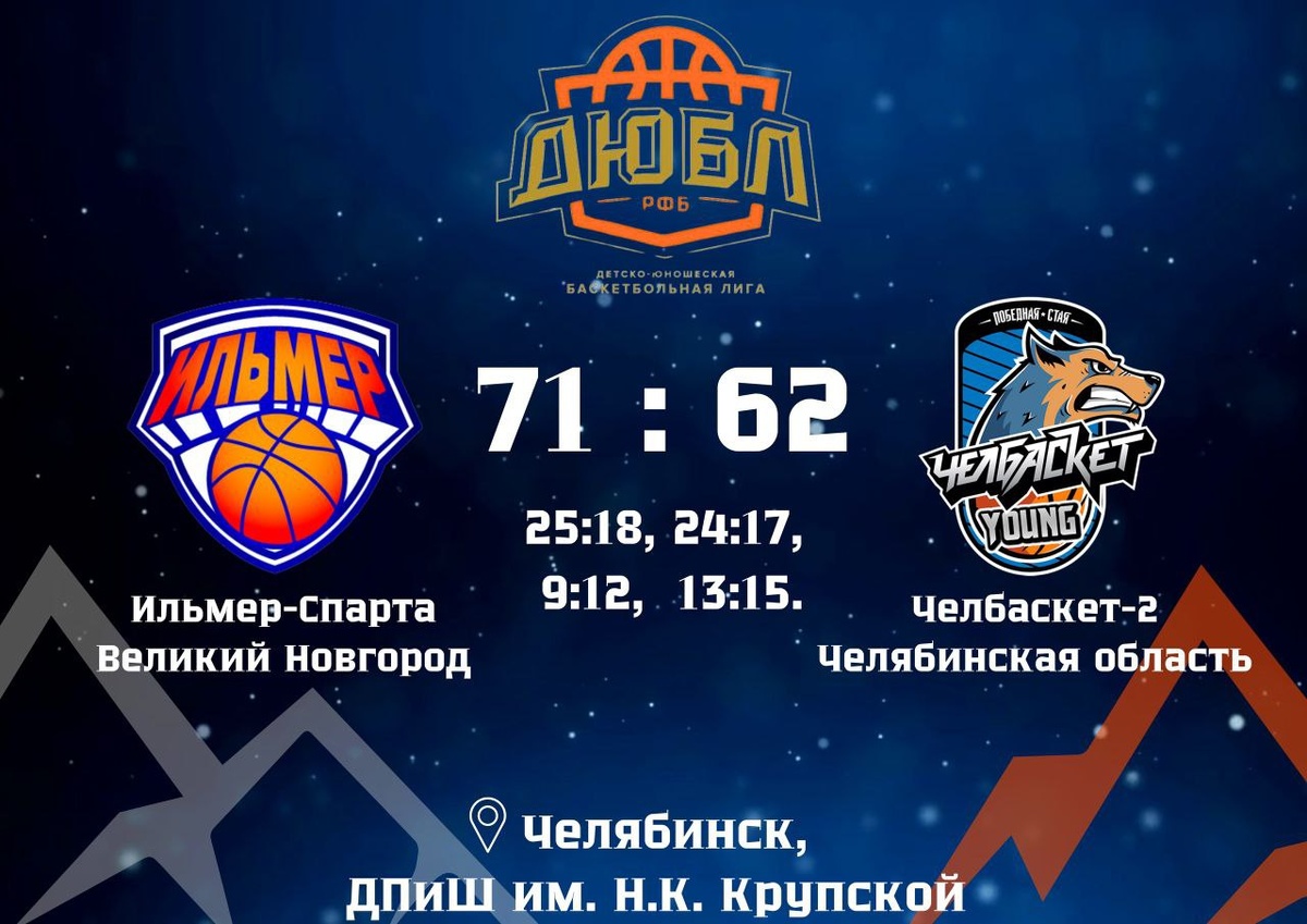 Вчера баскетбольный клуб «Ильмер» провёл очередной матч в рамках «Дюбл». Новгородские спортсмены отправились на выездной поединок с командой «Челбаскет 2», который завершился победой. Сегодня, в 13:30 по местному времени Челябинска (11:30 по московскому), «Ильмер» сыграет свой второй матч с командой «Парма» в рамках «Дюбла». Прямая трансляция доступна на сайте Российской федерации баскетбола по следующей ссылке: [Ссылка на матч](https://russiabasket.ru/games/906490?apiUrl=https://org.infobasket.su&lang=ru)