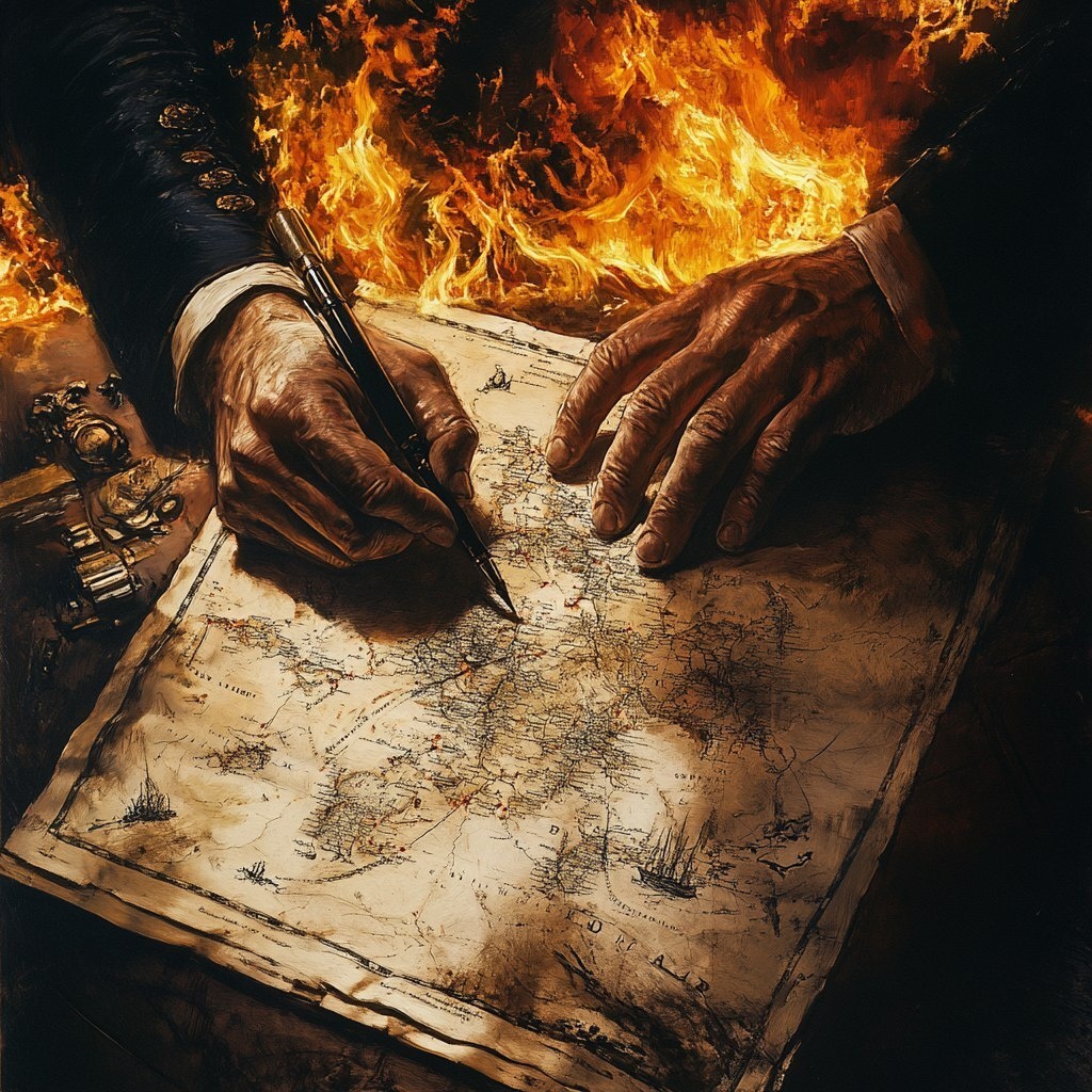 Создано на основе запроса: Cut to history book burning → Napoleon rewriting the map with his pen