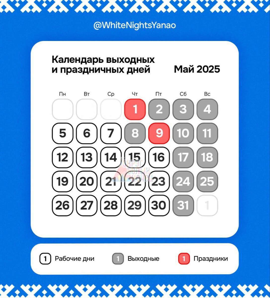 📆Как будут отдыхать ямальцы в мае Северяне смогут отдохнуть с 1 по 4 мая в связи с национальным праздником Весны и Труда и с 8 по 11 мая в честь Дня Победы. Сохрани карточку и поделись с близкими, вдруг они не в курсе⬆ Подписаться | Прислать новость