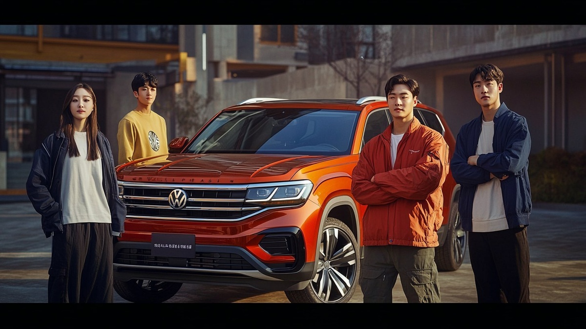 Создано на основе запроса: a hyper realistic picture of a four Koreans in their 20s standing in front of a Volkswagen Atlas