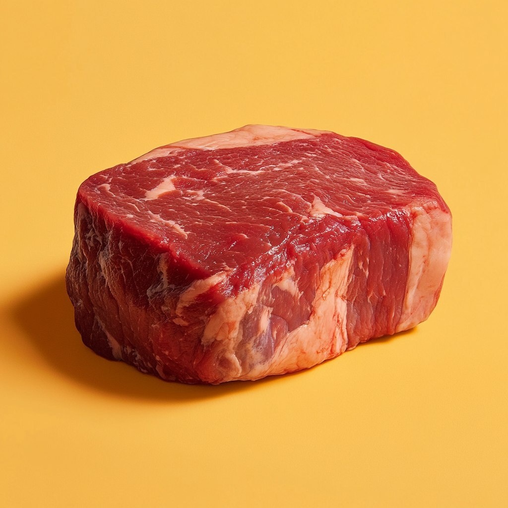 Создано на основе запроса: a raw beef chuck, fresh and vibrant, with a rich marbled texture and deep red color, placed against a pastel