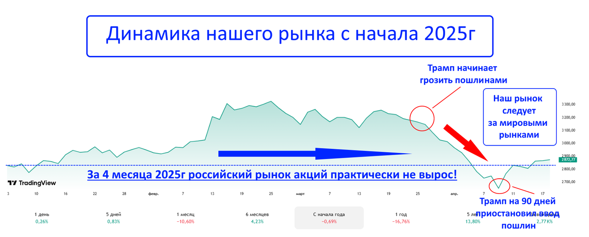 Через 5 дней у меня зарплата, а значит пришло время подготовиться к покупкам. Я инвестирую уже более 5 лет и в этой статье покажу список из 5 качественных дивидендных акций, которые планирую добавить в свой портфель 25 апреля - как много пятёрок получилось :) На скрине динамика рынка с начала 2025г, за 4 месяца он практически не вырос. Реальных драйверов для роста пока нет - конфликт РФ с Украиной продолжается, Трамп затеял торговую войну со всем миром, а ключевая ставка ЦБ на максимуме. Кстати, 25 апреля будет очередное заседание ЦБ по ставке, эксперты (20 из 21 опрошенных аналитиков) считают, что её оставят без изменений, т.е. на уровне 21%. В этом интриги нет, я думаю, ключевая ставка достигла своего пика и больше повышаться не будет. Важно то, какой сигнал пошлёт ЦБ и если его риторика будет мягкой, появится надежда на скорое снижение ставки - это может вызвать рост нашего рынка. Но всё равно, сейчас наибольшее влияние на рынок акций оказывает геополитика, а в ней много неопределё
