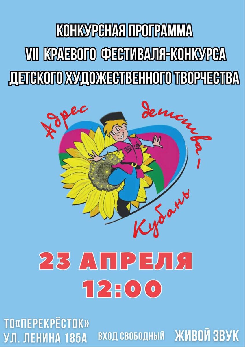 🌟Дорогие друзья! Приглашаем вас на 7-й краевой фестиваль-конкурс детского художественного творчества «Адрес детства - Кубань!»! 🎨✨ 📅 Когда: 23 апреля 🕛 Время: 12:00 📍 Где: ТО «Перекрёсток», ул. Ленина, 185а 🎟 Вход свободный! Живой звук! Приходите поддержать юных талантов нашего города и насладиться их творчеством!
