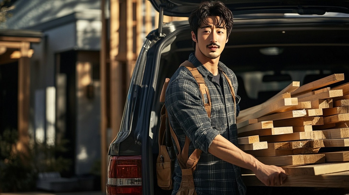 Создано на основе запроса: a hyper realistic image of a handsome korean carpenter in his 30's loading a trunk of the Volkswagen Atlas