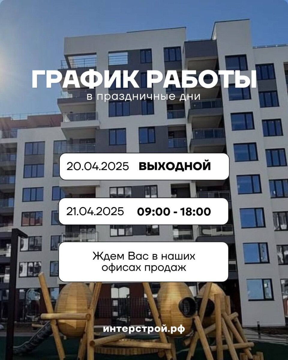 Уважаемые Клиенты, воскресенье, 🗓️ 20 апреля - у отделов продаж, а также call-центра ГК ИнтерСтрой выходной день.