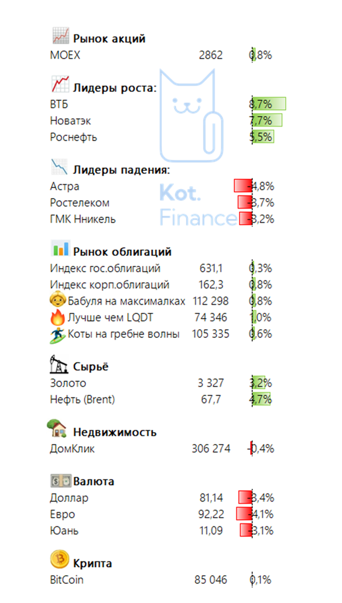 Рынки акций штормит, а бонды зеленеют. Недвижимость остывает после бурного роста 🤝Присоединяйся к сообществу Кот.Финанс -- Новые размещения •Мегафон (ААА) КС+1,7% на23 мес. Интерес: ★☆☆☆☆ •Акрон (АА) 8,75% в $ на2,5 года Интерес: ★★☆☆☆ 💬подойдет для ИИС •Самолет (А) 25,5% на3 Интерес: ★★☆☆☆ •ПКБ (А-) 25% на3 года🔔call через 1,5 Интерес: ★☆☆☆☆ 💬не интересна ни отрасль, ни доходность, ни call •С-Принт (В+) 32% на5 лет для квалов Интерес: ★★☆☆☆ Интересные события •Реструктуризация долга Segezha в акции одобрена •облигации ОКЕЙ серии 001Р-02 становятся неликвидом. После серии невыгодных инвесторам оферт, выпуск объемом 5 млрд превратился в 150 млн •Борец перешел под контроль РФ. Ждем развития событий с бонд-холдерами •Самолет перенес размещение флоатера на неопределенный срок •Моторика выкупила по оферте почти половину выпуска и становится неликвидом •Инфляция в годовом выражении 10,38% (пред.значение 10,28%) 🌶Кузина тех.дефолт по выпуску БО-П02 🌶Феррони тех.дефолт по выпуску БО-02 ?
