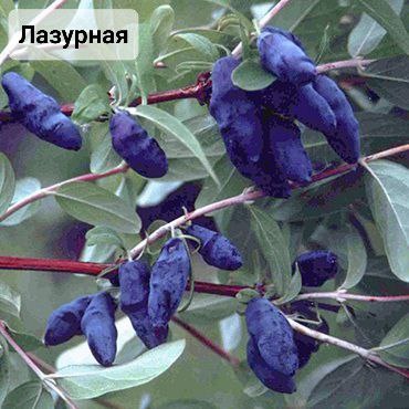 Среднеранняя жимолость Ягоды крупного размера (массой 0,9 — 1,4 г, в длину — 1,5 — 2 см), Кожица средней плотности, темно-синего цвета с голубым налетом. Прочность прикрепления ягод средняя. Мякоть нежной консистенции, приятного кисло-сладкого вкуса (практически без кислинки), без горечи, с черничным ароматом. По использованию сорт универсальный (желе, варенья, компоты, вина, соки). Сорт зимостоек, влаголюбив, устойчив к болезням и вредителям. Сорт частично самоплодный (27%). Среди лучших опылителей выделяют сорта: Золушка, Голубое веретено, Герда, Синяя птица. К главным достоинствам жимолости Лазурная относят: крупные плоды с хорошим вкусом, частичную самоплодность, слабую осыпаемость ягод.