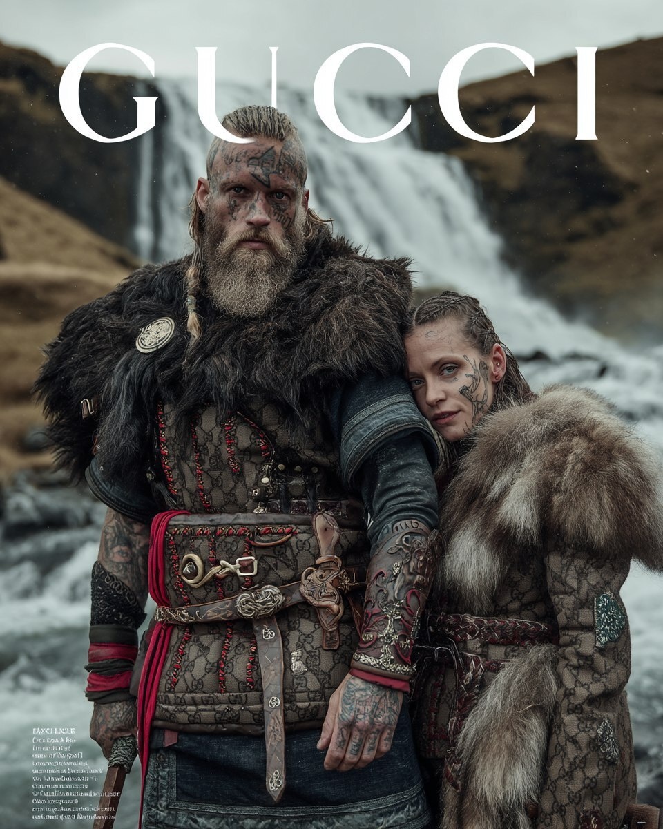 Создано на основе запроса: Photo of a viking in rural iceland, in the style of Gucci, featuring a ragnar lothbrok esque viking and his viking wife, he is wearing gucci print viking clothing and standing in front of an icelandic waterfall, he has viking tattoos over his whole body, magazine cover shoot for "GUCCI" magazine, shot by Tim Walker. --- Автоперевод: Фото викингов в сельской местности Исландии, в стиле Гуччи, в котором представлены викинги Рагнар Лотброк Эск и его викинговой жене, он носит викингу Гуччи и стоял перед исландским водопадом, у него есть тату Интересно вышло? 🤔 https://dzen.ru/id/65c0c65c86e4f837c27b24d7 #ИИ #AI #нейросеть #midjourney #art