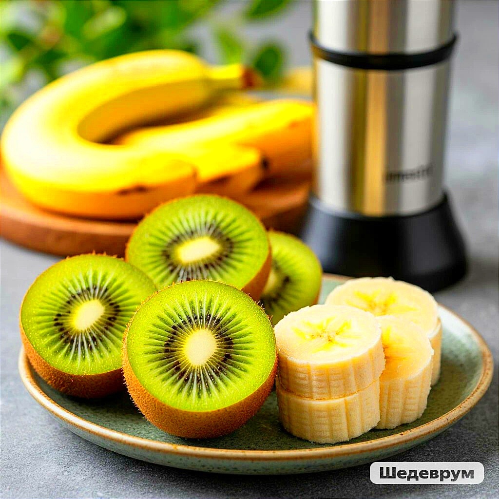 Вкусно, полезно, быстро. О пользе тут И тут Там и написано почему такое количество ингредиентов. А пропорции уже подбирала я сама, доводя раз за разом до идеального для меня сочетания. Мне хотелось добиться игривости, бодрости киви, чуть смягчённым лёгким бархатом банана. • ½ банана • 2-3 киви (от размера зависит) • Сахар (можно заменить мёдом) • Лим.кислота (можно заменить на аскорбиновую в порошке) Вода Выход 600мл . 1. Киви разрезаем пополам ("по экватору", если разрезать "по мередиану", то потеряете больше сока и мякоти) 2. Чайной ложной отделить мякоть от шкурки. Просто втыкаем ложку по шкурке "попой" к шкурке, "лодочкой" к мякоти, чтобы "попа" касалась шкурки максимально близко, но при этом не порвалась, и аккуратно вводим ложку вглубь, "ко дну" ягоды, придерживая это "дно" ладонью второй руки так, чтобы чувствовать когда ложка его коснётся. И проворачиваем ложку по всей окружности, по шкурке. Скидываем в чашу погружного блендера отделившуюся мякоть. Если на "дне" шкурки ещ