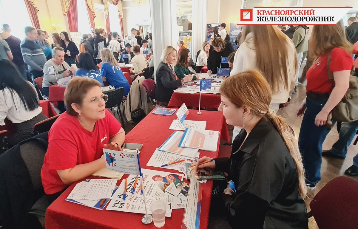 2️⃣0️⃣0️⃣ вакансий представила Красноярская железная дорога на региональном этапе Всероссийской ярмарки трудоустройства «Работа России. Время возможностей», который прошёл 18 апреля в красноярском Доме офицеров. 🔎 На площадке ОАО «РЖД» работали специалисты сектора подбора персонала социально-кадрового центра магистрали. Посетителей интересовали не только офисные вакансии (бухгалтер, экономист, юрист), но также инженерные должности и рабочие специальности. Многие соискатели рассматривали трудоустройство для себя и своих родственников, активно задавали вопросы о зарплате, соцпакете и возможности переквалификации. – Мы собрали более 50 анкет и резюме. Уже направили ряд кандидатов работодателям, сейчас обрабатываем информацию, – рассказала начальник сектора подбора персонала Александра Матвеева. – Планируем участие и в следующем этапе ярмарки 27 июня. 📌 Посетители могли узнать о возможности трудоустройства как в Красноярске, так и в других регионах, а также как пройти переобучение в