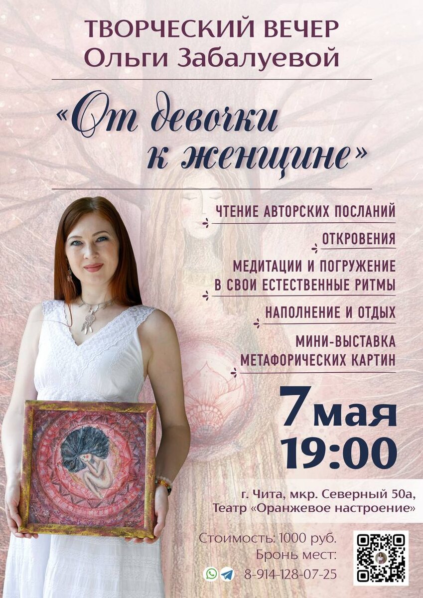 Творческий вечер Ольги Забалуевой «От девочки к женщине» Что вас ждет: ✨чтение авторских посланий; ✨откровения; ✨медитации и погружение в свои естественные ритмы; ✨наполнение и отдых; ✨мини-выставка метафорических картин. Вечер ведет художница, магистр психологии, арт-терапевт, автор серии метафорических открыток на тему рода Ольга Забалуева. Она говорит, что ее картины и текстовые послания помогают по всему миру десяткам тысяч людей. 🕐7 мая, 19:00. 📍театр «Оранжевое настроение», мкр Северный 50А. Вопросы и запись: @Olga_zabalueva_art #Афиша Предложить публикацию @zabkulisye_bot