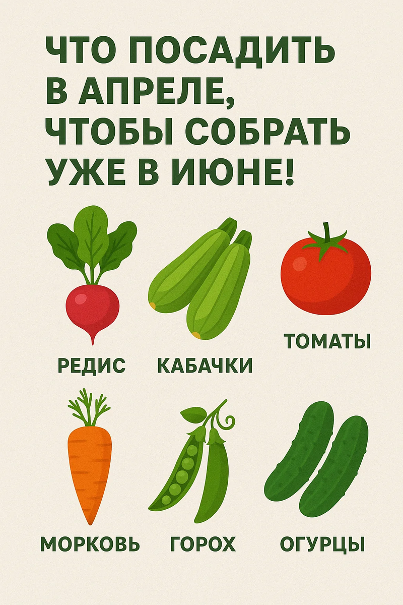 Весна пришла, а это значит, что пора готовить землю и начинать первые посадки. В апреле можно не только подготовить почву, но и заготовить первый урожай, чтобы уже в июне наслаждаться вкусными, свежими овощами. Итак, вот несколько культур, которые можно посадить в апреле и которые порадуют тебя первым урожаем уже через пару месяцев: 🥬 Ранний редис Редис — это настоящий чемпион по скорости роста! Этот овощ готовится к сбору уже через 20–30 дней после посадки. А если хочешь ускорить процесс, лучше всего посадить его под плёнку или в теплицу. Так что, если у тебя есть терпение только на пару недель, редис — идеальный вариант для тебя! Совет: Помни, чем быстрее редис растёт, тем нежнее он получается. Поэтому не жди, когда он перерастёт, и собирай его как можно скорее! 🧅 Лук на перо Зелёный лук — это тот самый "свой" продукт, который идеально подходит для первых салатов с дачи. Посаженный в апреле, лук даёт зелёные перья всего через 2–3 недели. Зелёный лук, к тому же, можно срезать нескол