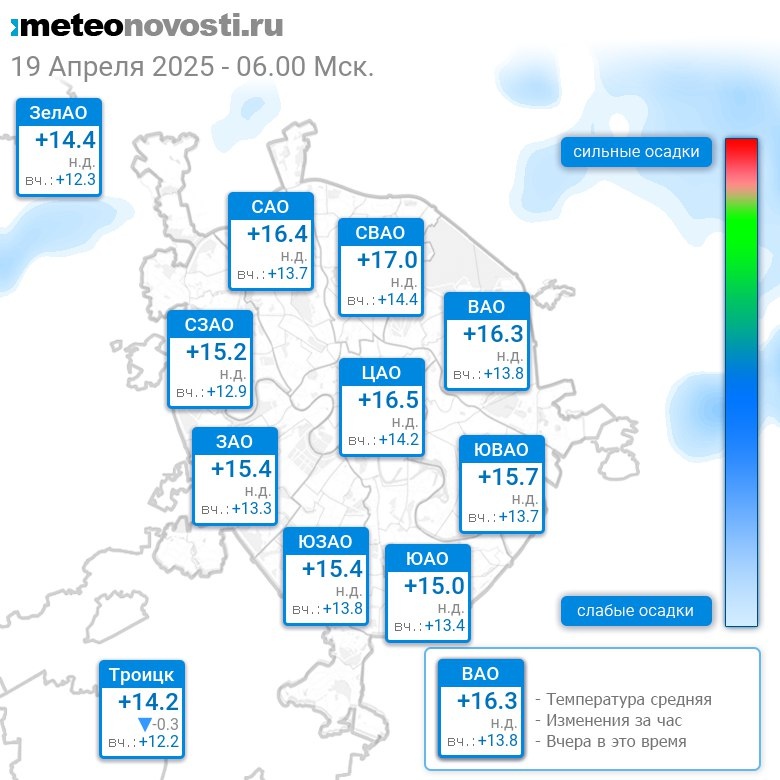 В 6:00 в Москве было от +12.7°C до +17.5°C, средняя температура +15.6°C #погода #Москва #весна #температура #19апреля #суббота Перейти на сайт Прогноз погоды на 14 дней