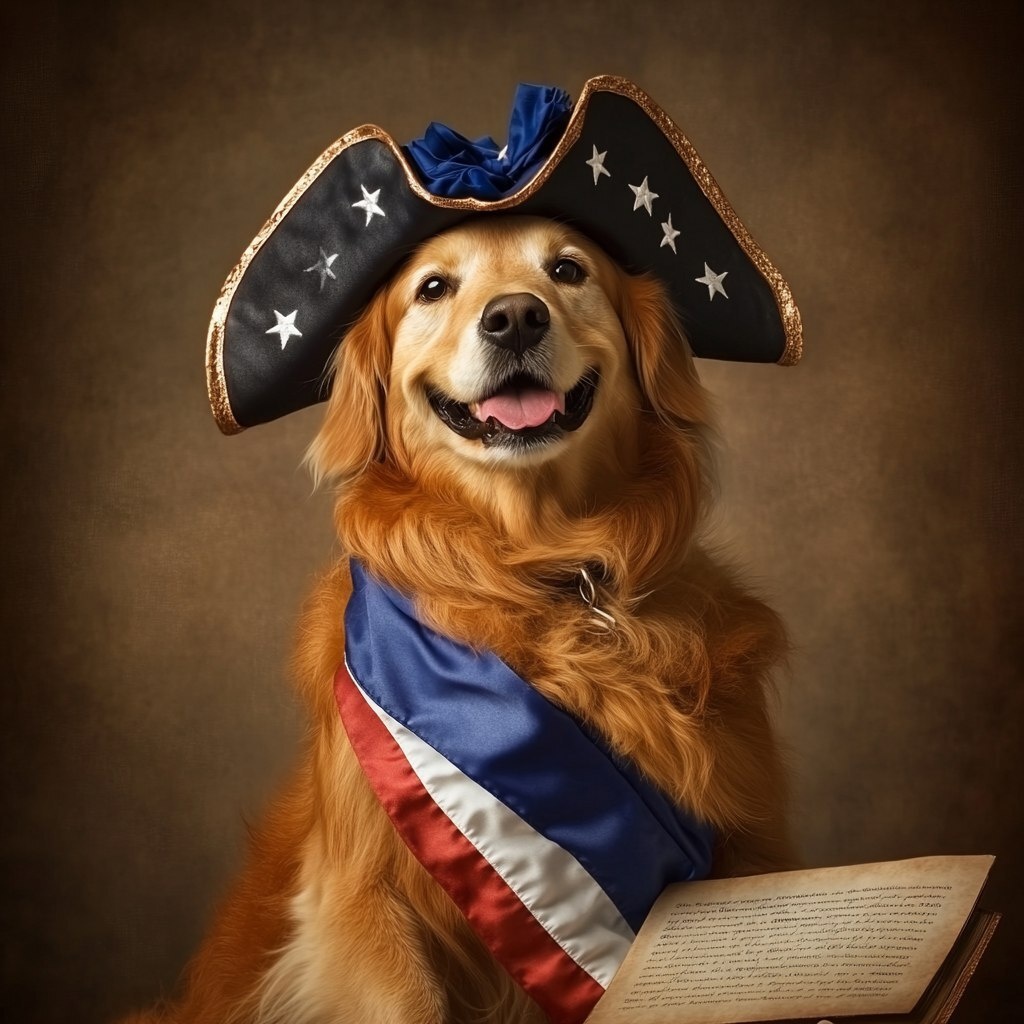 Создано на основе запроса: A golden retriever wearing a colonial American tricorn hat with a blue ribbon, sitting proudly with a gentle smile, in front of a soft parchment background. Add a patriotic sash (red, white, and blue) and a scroll or book at her paws. Style should be semi-realistic, child-friendly, warm, and historically inspired. --- Автоперевод: Золотой ретривер в колониальной американской шляпе с трыжником с голубой лентой, с гордостью с мягкой улыбкой, перед мягким пергаментом. Классно получилось? 🤔 https://dzen.ru/id/65c0c65c86e4f837c27b24d7 #ИИ #AI #нейросеть #midjourney #art