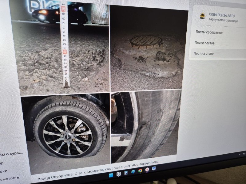 Житель Пензы пожаловался в социальных сетях на огромную яму на улице Свердлова, которая стала причиной повреждения его автомобиля. По словам автора поста, яма образовалась вокруг канализационного люка и с момента таяния снега становилась всё глубже, достигнув, по его измерениям, 10 сантиметров. В подтверждение своих слов пензенец опубликовал фотографии пробитого колеса и самой ямы, рядом с которой для наглядности разместил измерительную ленту. Он также отметил, что в результате инцидента у него вытекла тормозная жидкость. «Ремонтом никто не собирался заниматься и не собирается. Мало того, что повреждено колесо, так ещё и вытекла тормозная жидкость. И так по всему городу. Никакой безопасности на дорогах», – возмущается автор публикации. Официальные ведомства пока не отреагировали на данное обращение.