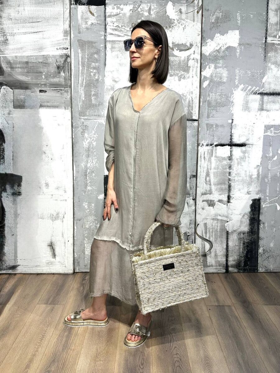 Продолжаем обзор коллекции весна–лето 2025 от итальянского бренда SANCTAMUERTE. ⠀ Изумительное платье из шелка с деликатным блеском в светло-сером оттенке с бежевым подтоном. V-образный вырез изящно подчеркивает ключицы, спущенное плечо добавляет расслабленной женственности, необработанные края и элементы деконструкции придают современный характер. В боковых швах — потайные карманы. Образ дополнен жаккардовой сумкой-шоппером SORENA с бахромой в бежевой гамме и золотистыми сандалиями TRIPPEN. ⠀ Смотрите видео-обзор до конца — мы показываем другие модели из данной капсулы! _______________________ Для оптового сотрудничества пишите нам: 📲-в директ 📲-по номеру 8 800 511 51 95 📲- +7 495 146-92-72 📲Наш сайт — https://sollery.pro ✉️-на почту info@sollery.fashion