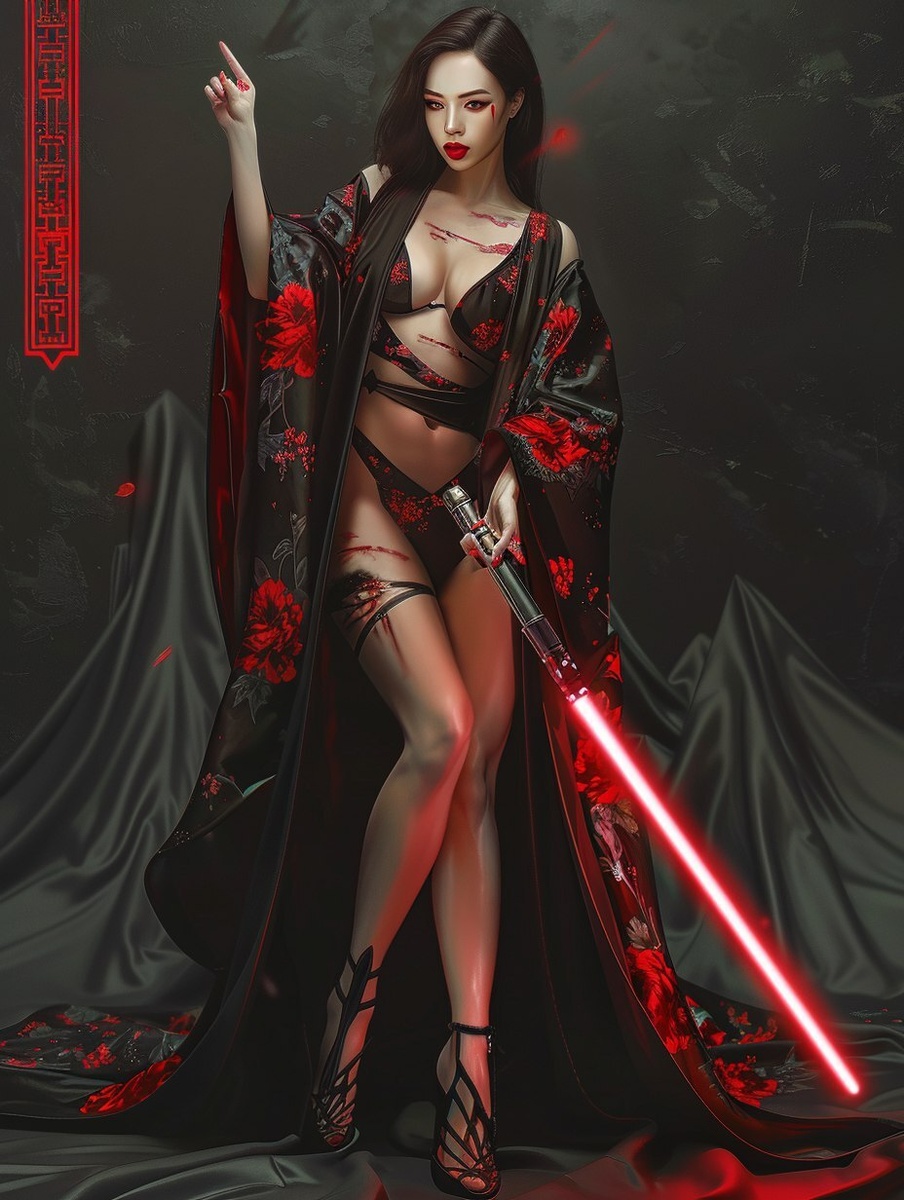 Создано на основе запроса: Beautiful woman in a black and red Sith robe, holding a lightsaber, in the style of Artgerm