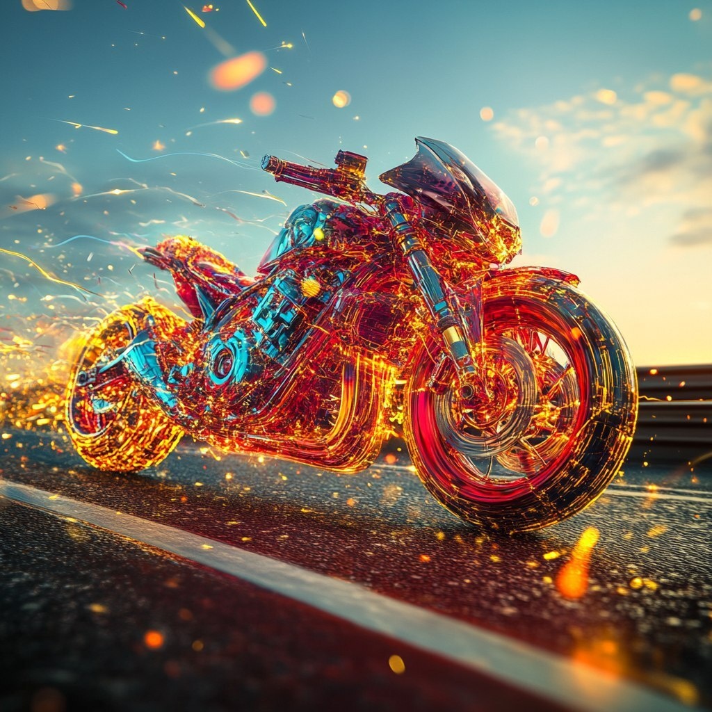 Создано на основе запроса: Motorcycles made of colored plastic parts are flying on the landscape highway with sparks flying everywhere