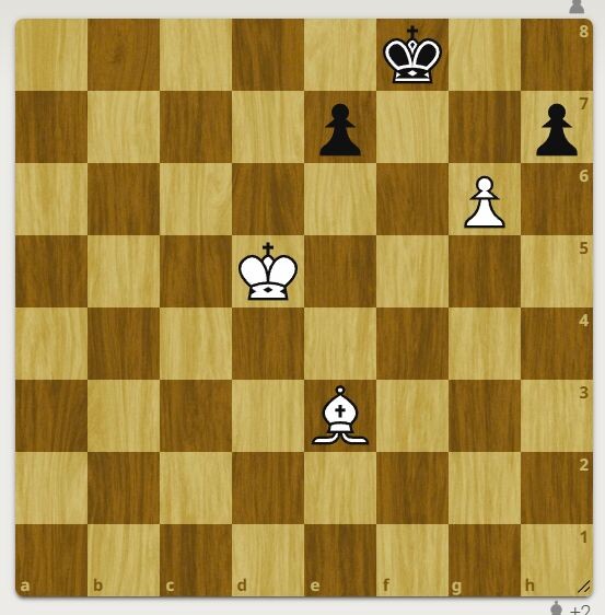 Этюд А. Троицкого, 1895 год. У черных 2 пешки, у белых 1 пешка и слон. Белые начинают и выигрывают. Более интересная задача тут >>> Решение смотрите далее, есть подробный видеоролик с разобранными вариантами. 1. Белые дают шах слоном на "h6". 1. ...................... черные отходят королем на "g8". 2. Белые двигают пешку на "g7". 2. .......................... черные идут королем на "f7". 3. Белые ставят ферзя на "g8". 3. ................... черные бьют ферзя на "g8". 4. Белые идут королем на "е6". 4. ........................ черные вынуждены пойти королем в угол. 5. Белые идут королем на "f7" и далее, после хода черной пешки, белые ставят мат слоном.