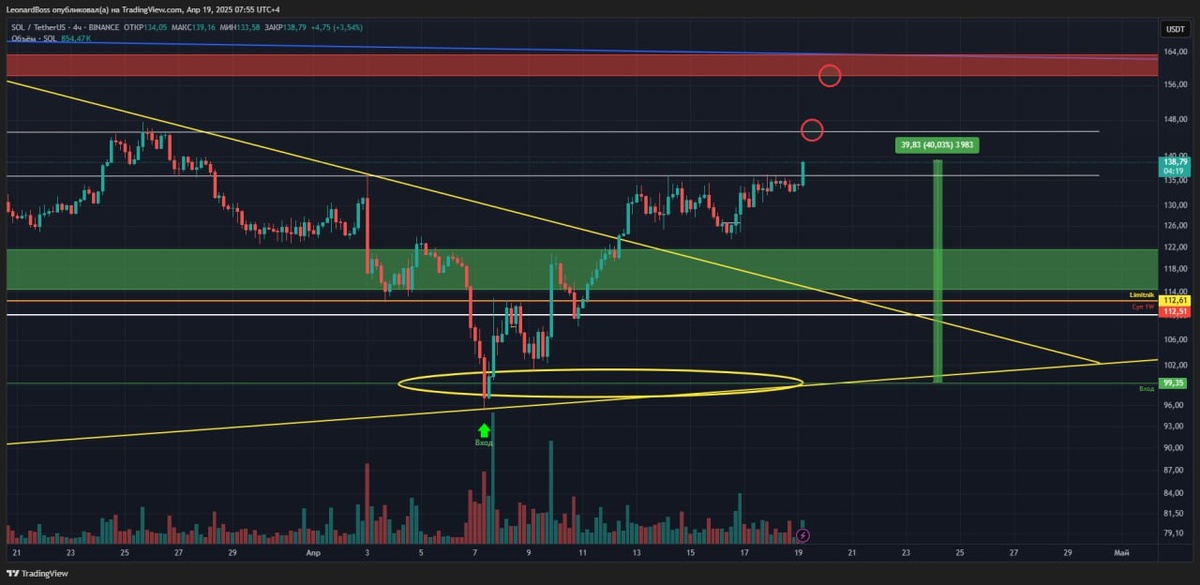 В ответ на пост #SOL 🔼🔼🔼 Коллеги, всем привет! Хватит дрыхнуть, выходные обещают быть эффективными и приятными!! ⚠️Итак, уровень 136$ действительно оказался крепким препятствием, на которое была потрачена практически неделя. Очень надеюсь, что 4Н крайняя свеча, которой собственно уровень повержен, станет началом продолжения тренда!! ⚠️До верхнего блока сопротивления с уровнем 160$, по пути есть промежуточная локальная зона сопротивления уровня 145$. Он хоть и минимальный, но всё же его нельзя игнорировать. Очень хорошо, что у нас 2 выходных и скорее всего воздействия BTC на рынок не случится. Если так, я думаю паровоз долетит к 160$ очень быстро!! P.s. при всем позитиве, профит для текущего рынка весьма хорош и чтобы его не растерять, вам просто нужно двигать стоп за ценой, всё-таки это ваши деньги, честно заработанные! Желаю всем замечательных выходных и да будет всем нам профит выходного дня!!))