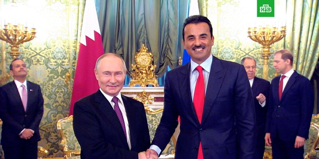 Короче говоря, на этой неделе наш Владимир Владимирович (это россиянам именно с ним повезло, по словам Вячеслава Володина, а вовсе не с полезными ископаемыми), принял в раззолоченных палатах Кремля сразу двух (но по очереди), высокопоставленных арабских гостей. Первым из них был Тамин ибн Хамад ибн Халифа Аль Тани, потомственный эмир Катара: мужчина видный, высоченный (см. фото) и харизматичный – до полной и нескончаемой невозможности. «Конфетка, а не мужчина», - как заметила, восхищённо вздохнув, одна из кремлёвских уборщиц. Кстати, как утверждают злые языки, красный галстук эмира Катара (см. фото), по своим размерам (то есть, в длину), превышает рост нашего Владимира Владимировича. Но это, как говорится, уже незначительные детали… А как господин эмир прибыл на встречу с Президентом России – это, вообще, отдельная песня. Ах, как он прибыл. С самой натуральной эмирской помпой и удалью. Кортеж растянулся – метров на триста пятьдесят. Чтобы издали было видно, что сам эмир Катара следует, а никакой там-ни-будь второсортный московский чиновник. Впереди, соответственно, торжественно следовал угольно-чёрный «Аурус» – краса и гордость гаража кремлёвского, украшенный приметными номерами, с которыми ещё несколько лет тому назад «Мерседес» Владимира Владимировича ездил. До тех пор, пока его («Мерседес»), в утиль не сдали за ненадобностью. Так как Владимир Путин (по идеологическим соображениям и причинам), решил больше на зарубежных авто не ездить… Эмир, кстати, тоже решил проявить по отношению к Владимиру Владимировичу повышенное уважение. То бишь, вместо традиционного арабского одеяния (белой длинной рубахи и цветастого головного платка), облачился в классический европейский костюм с галстуком (см. фото)… А встречали эмира пышно. В том смысле, что пышно-пышно-пышно и пышней уже не бывает. Народу высокопоставленного и важного собралось – практически без счёта. Кого там только не было: Сергей Лавров, Рамзан Кадыров, Денис Мантуров, Игорь Сечин, Алексей Миллер, Антон Силуанов, Эльвира Набиуллина, Кирилл Дмитриев и так далее. И это уже не говоря про самого Владимира Владимировича… Что эмир Катара? Не-не, нормально он себя вёл, безо всякой напыщенной спеси и высокомерия. С Кадыровым по-братски обнялся. Лаврова и Мантурова по-дружески по плечам похлопал. А с Президентом России за руку поздоровался – как равный с равным… Встреча, как принято говорить, прошла в тёплой и дружеской обстановке. Стороны много шутили и лучезарно улыбались друг другу. Выступая с приветственной речью, Владимир Путин высказался в следующем ключе: - «Отношения между Россией и Катаром неизменно укрепляются. А общий товарооборот между нашими странами хоть сейчас и скромный, но Катар всегда являлся и является нашим ключевым партнёром по нефтегазовым вопросам. Плюсом нынче Россия – через РФПИ – инвестировала в экономику Катара порядка миллиарда долларов США. А ещё мы регулярно занимаемся совместными гуманитарными и спортивными вопросами. Напомню, что именно господин эмир оказал нам решающее содействие в получении права провести Олимпиаду-2014 в Сочи и Чемпионата мира по футболу в 2018-ом году… Конечно, очень важно будет сегодня рассмотреть и вопросы, связанные с горячими точками. Мы знаем, что Катар предпринимает очень серьёзные усилия по поводу разрешения израильско-палести