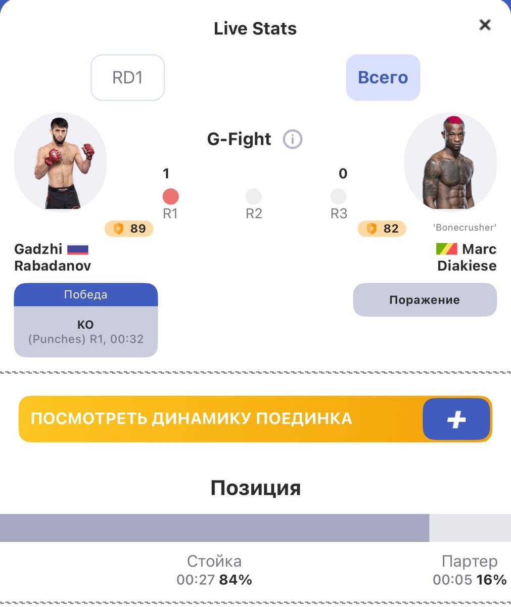 Всего лишь 19% опрошенных точно предсказали, что в поединке Гаджи Рабаданова всё решится в стойке, однако сам поединок продлился всего 32 секунды! 😁 Узнать результаты и аналитику остальных боёв PFL и LFA можно в нашем бесплатном приложении Stats Fight, доступном в AppStore 📱 и Google Play 📱 )