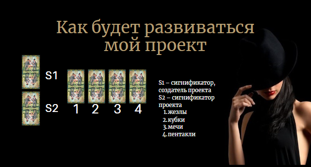 S1 – сигнификатор, создатель компании / проекта S2 – сигнификатор фирмы / проекта 1. жезлы: развитие рост, статус, успех с точки зрения социального одобрения 2. кубки: что у меня с людьми? сотрудники, клиенты, партнеры 3. мечи: перемены, грянет ли экономический кризис, как он скажется, учеба 4. пентакли: деньги, что с темой денег? Король воздуха Философ и романтик. Неисправимый оптимист. Всегда верит в лучшее и ожидает чуда, несмотря на то что жизнь постоянно пытается переубедить, подстраивая ситуации, выставляющие его простофилей и недотепой. Ситуации наступания на одни и те же грабли. Экспериментатор, который постоянно проводит опыты. Солнце Творческая самореализация. Окрыление. Самосовершенствование. Раскованность. Гармония. Счастье. Перспективы. Прогресс. Чистота. Искренность. Открытость. Ясность. Истина. Пробуждение. Раскрытие внутреннего потенциала. Колесница Фантазии. Мечты. Возвращение к прошлому. Мир воспоминаний. Обратный ход. Разработанный сценарий. Круто запрягли, но Ко
