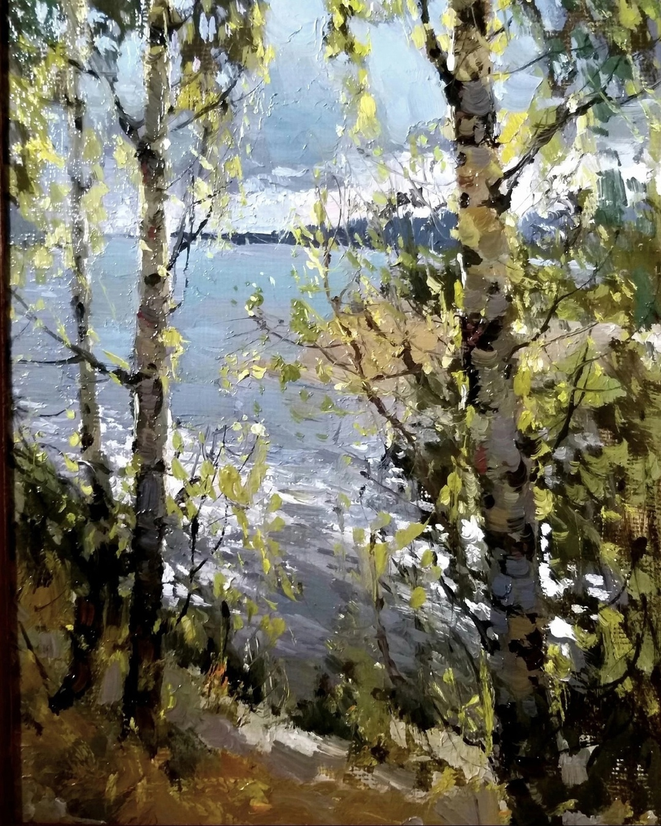 Если судить по легкости и прозрачности листвы, весна еще только набирает силу. Берег крутой, практически обрыв. Вода темная и неспокойная, да и небо затянуто тучей, через которую все равно проглядывает солнце, как обычно и бывает весной и летом. Состояние природы то ли перед дождем, то ли сразу после дождя.