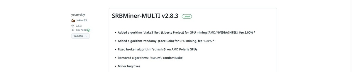 SRBMiner-MULTI v2.8.3 — Добавлен алгоритм 'blake3_lbrt' (Liberty Project) для майнинга на GPU [AMD/NVIDIA/INTEL], комиссия 2,00% * — Добавлен алгоритм «randomy» (Core Coin) для майнинга на CPU, комиссия 1,00% * — Исправлен неработающий алгоритм ethashr5 на видеокартах AMD Polaris. — Удалены алгоритмы: «aurum», «randomtuske». — Исправлены незначительные ошибки. Скачать