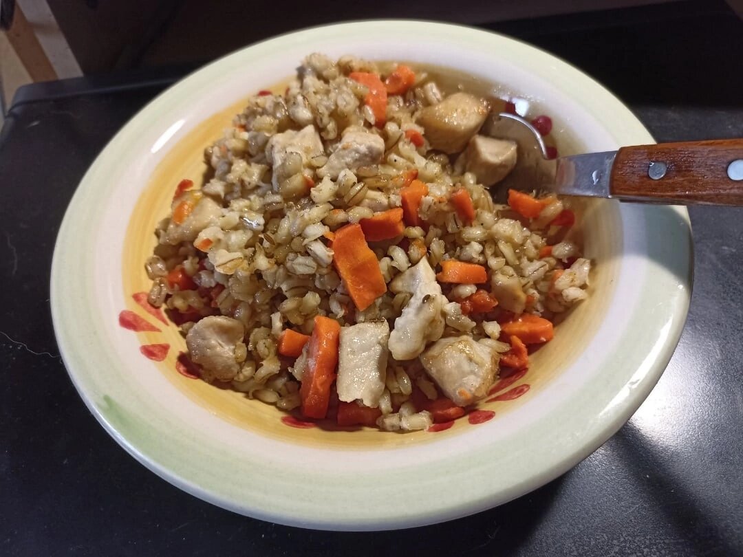 Те, кто знают меня близко, сейчас готовы будут вскричать о том, а не съехала ли часом со своих катушечек Женечка, которая всегда ратует за правильный узбекский плов самаркандского пошиба и рожу свою московской плюшкой складывает на несоответствующий. Ибо чуйка и ориентация на тру-пловчик - это одна из моих базовых прошивок. И вот вчера она со страшным скрежетом рухнула. Перед вами - пловешник из перловой крупы. И он стоит часа времени. Итак. Две крупных луковки, лучше белых, но за неимением пойдут любые. Режем кубиками, пихаем в разогретое масло, жарим до румянца, пока не застесняются. Туда же кубиками куриное филе - уже нарушение пловной технологии, ахтунг и эттеншен, но спокуха. Далее. Как схватится и начнёт поджариваться за грехи свои, хотя какие там грехи у курочек... Развивать тему не станем, лучше утрëм слезу непрошеную и продолжим. Туда же две огромные красные морковки, не постесняюсь этих слов, нарезать хоть как, пофигу. Главное огромные. Это уже второй косяк - в нормал