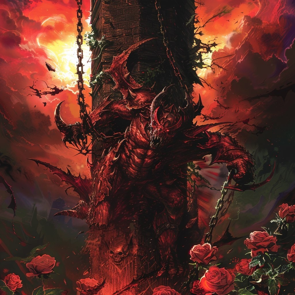 Создано на основе запроса: red demon chained to a tall tower, surrounded by roses , deep colors, dawn, horrorcore, directional light