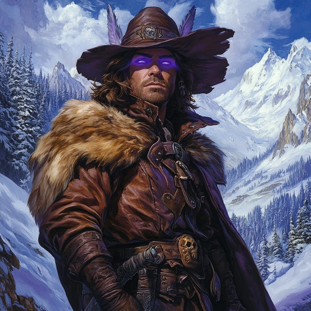 Автоперевод: Сильный мужской волшебник, коричневые волосы, в зимнем халате из кожи и меха, его шляпа имеет большую краю, у него фиолетовая магия в глазах, горная обстановка, стиль Джеймса Дитца