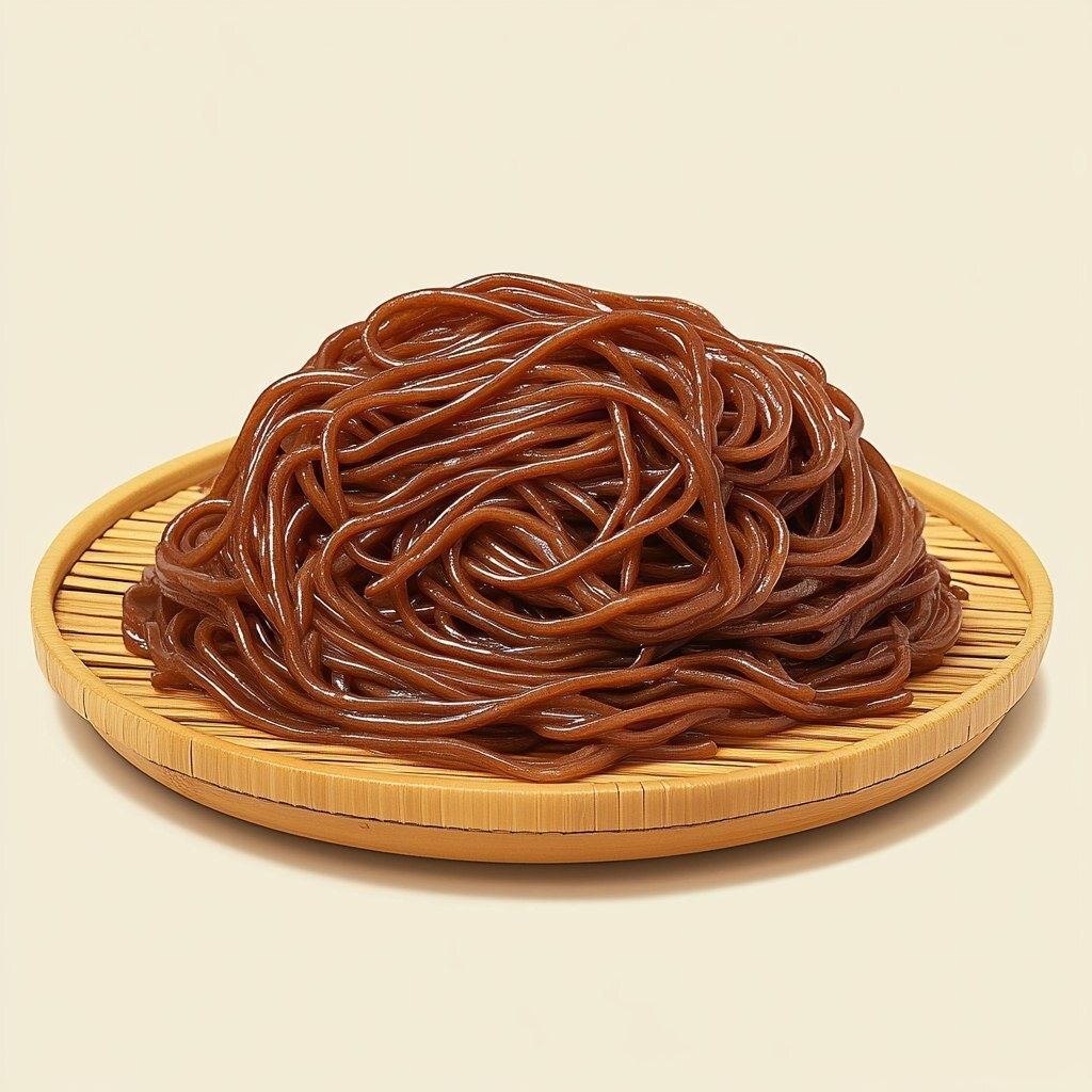 Создано на основе запроса: a pile of brown rice noodles (bún gạo lứt), thin, long, and slightly curled, with a reddish-brown hue, arranged
